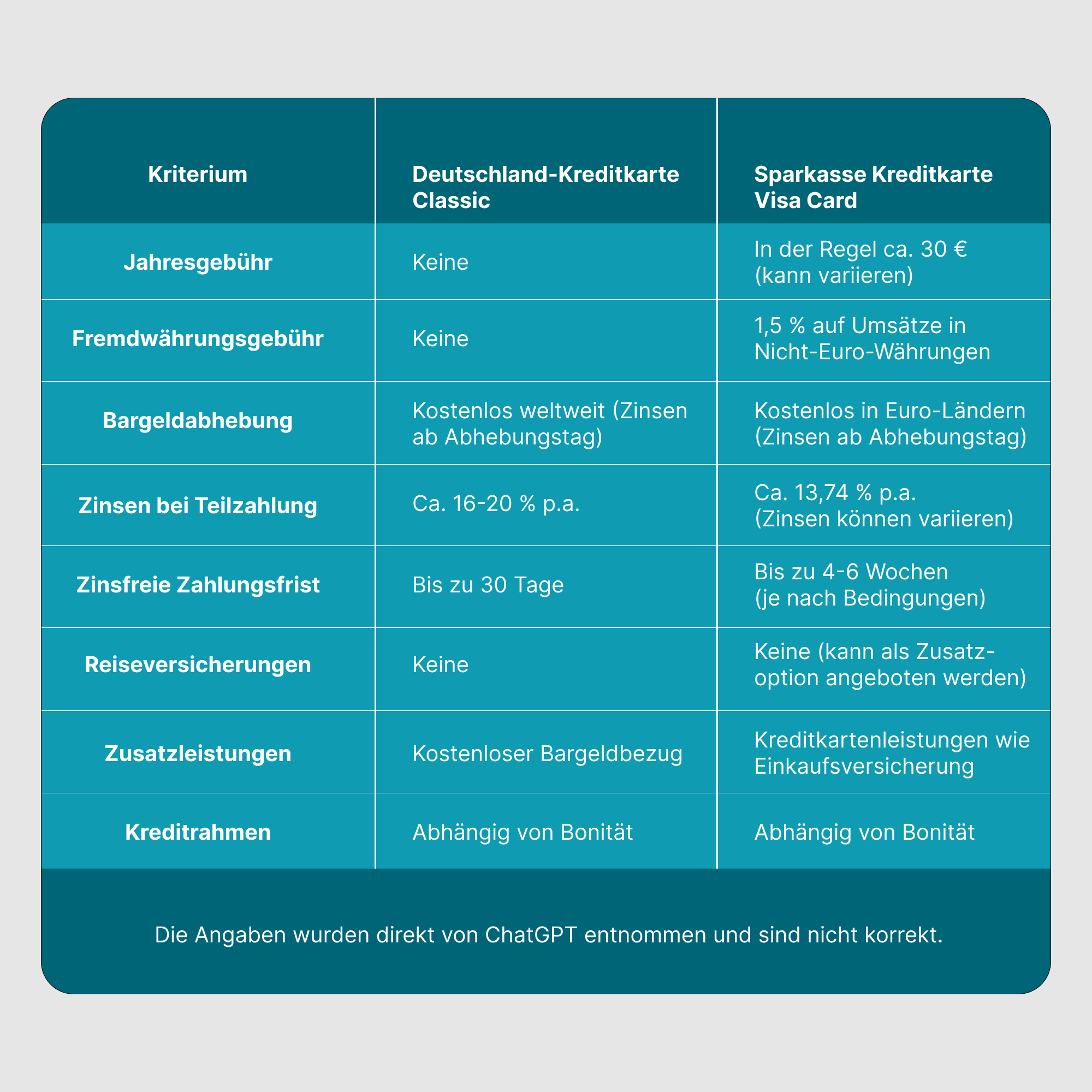Die Angaben in der Tabelle sind direkt von ChatGPT übernommen. Auch hier können Sie sehen, dass nicht viele Angaben nicht korrekt sind. Vergleichen Sie daher besser die Kreditkarten.